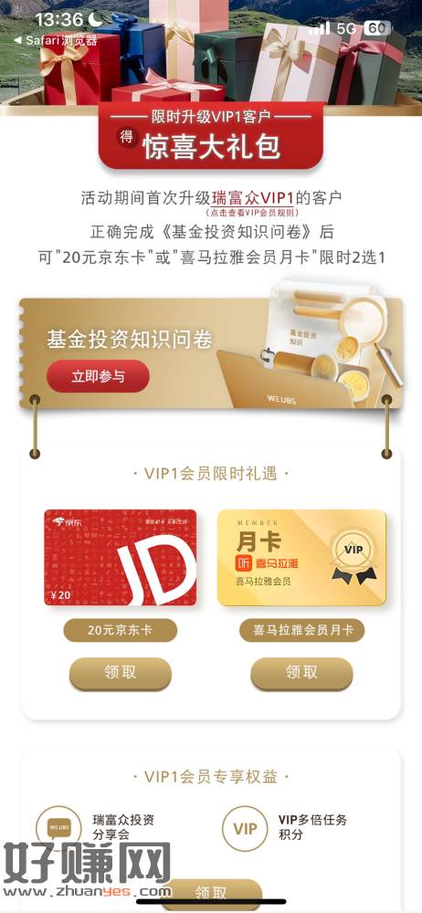【瑞银基金销售】最后5天,限时升级VIP1会员,可领20元京东卡,立即参与