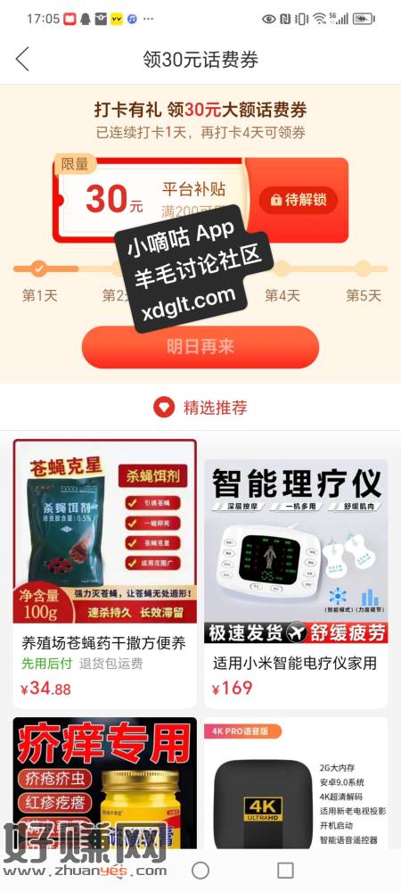 拼多多打卡五天领三十元话费券,自测,本来想看看怎么变现拼多多红包的,无意间看见的