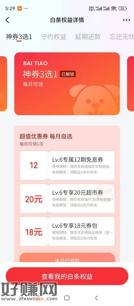 京东金融 白条 权益 v6拿20超市券