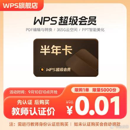 10点 教师节 WPS超级会员半年卡0.01亓 5000件