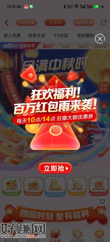 善融首页横幅有红包雨 概率中99-50 可以买点日用品