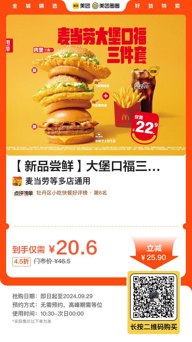 美团到店,麦当劳大堡口福三件套仅20.6