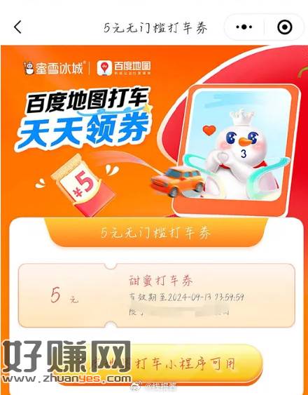 蜜雪冰城小程序头顶banner可以领百度地图5r打车券【当天有效】