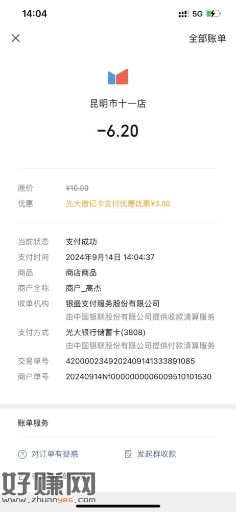 微信扫度小满商家码用光大借记卡支付10-3.8