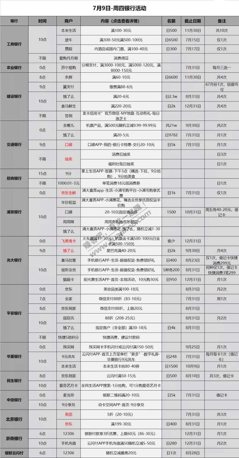 7.9各大银行薅羊毛活动