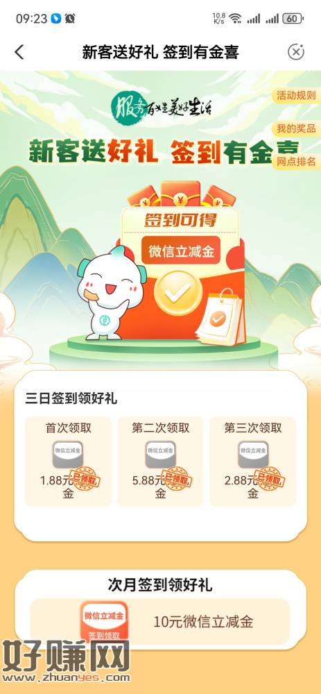 经证实,签到第二天是2.88,第三天是5.88