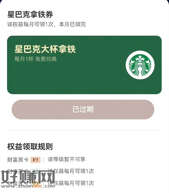 支付宝的财富黑卡每个月可以嫖一杯星巴克,v2以上就行,不用谢