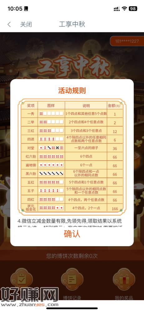厦门地区工行任务中心有个中秋抽奖,一个人能抽6次,我运气比较