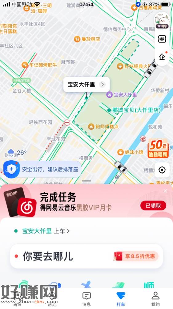高德地图App,打车点签到网易音乐VIP会员月卡