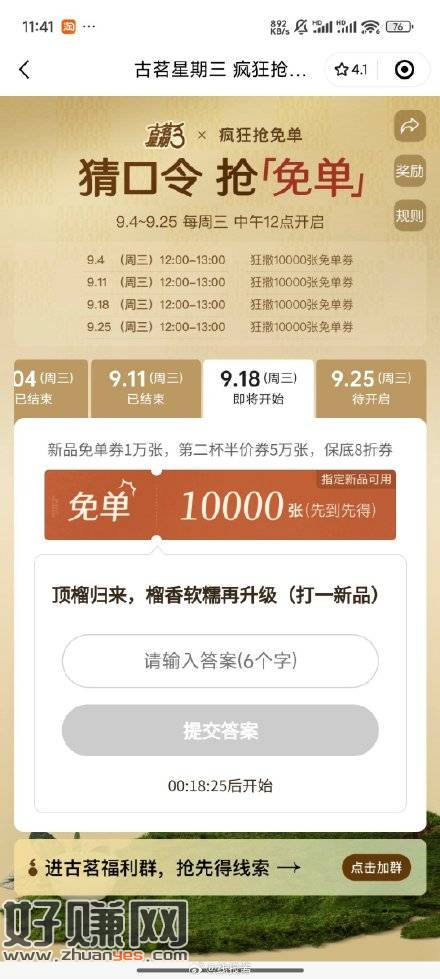 12点古茗免单,口令预计:榴莲芒芒麻薯