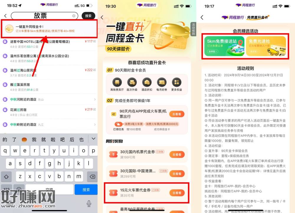 同程旅行APP搜索“放票”->领90天金卡会员,其中包含新客火车票35-15亓券+订火车票享前5KM免费接送站