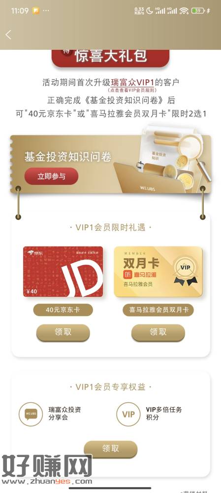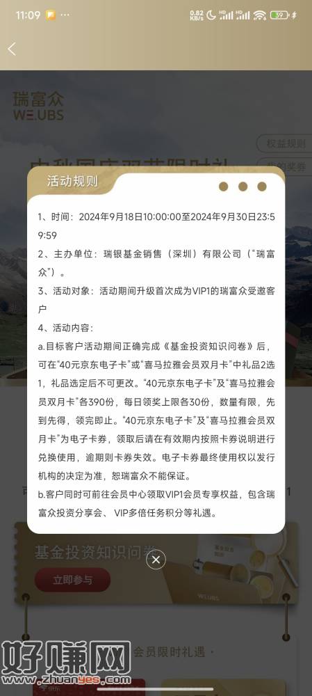 每日30份【瑞银基金销售】庆中秋国庆,限时升级VIP1会员,完成任务后,可领40元京东卡或喜马拉雅双月卡,点击