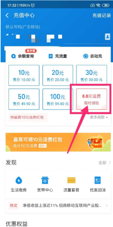 第一步:打开支付宝app->充值中心,如图领20减8.8元的券