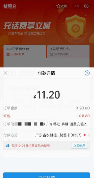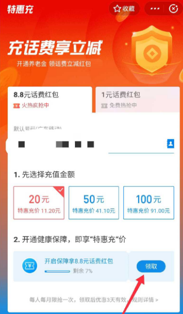 第二步:先支付1分投保,回来冲20话费付款11元,话费秒到