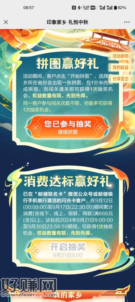 路径-邮储联名卡公众号,右上,需要闪光卡,并且中秋期间消费666元抽奖。9月21日九点开启抽奖。