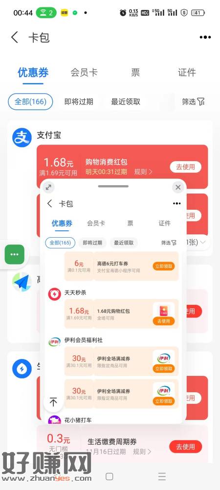 支付宝卡包里当天确实没领过1.68劵,就多清理几次多退几次,
