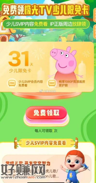 【极光TV免费领少儿会员月卡】打开活动地址->直接领31天会员->电视上观看少儿频道可用