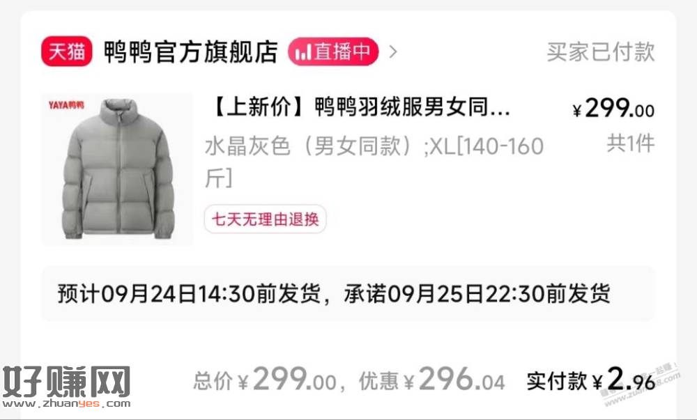 吧友发的线报,几块钱的鸭鸭羽绒服(需服饰299-150消费券)
