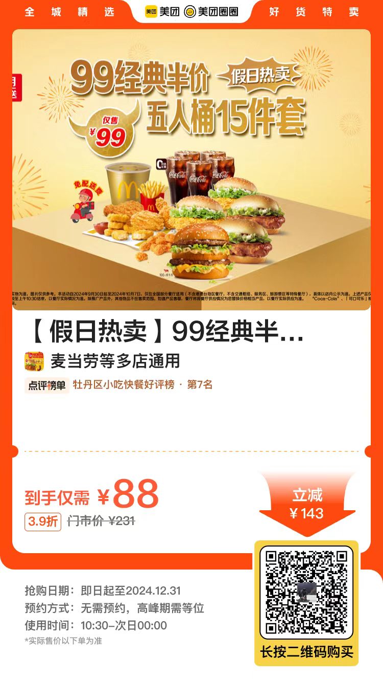 88,麦当劳|【假日热卖】99经典半价五人桶15件