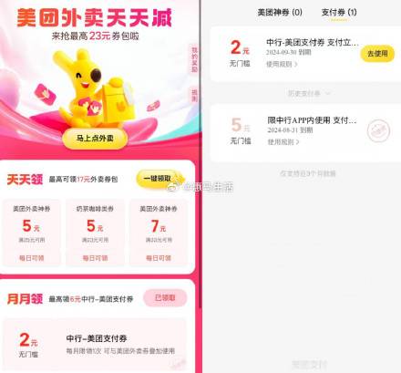 【中行领取美团2亓外卖支付券】中行APP搜索“美团”->进入自动领2亓支付券,可以和美团红包叠加使用