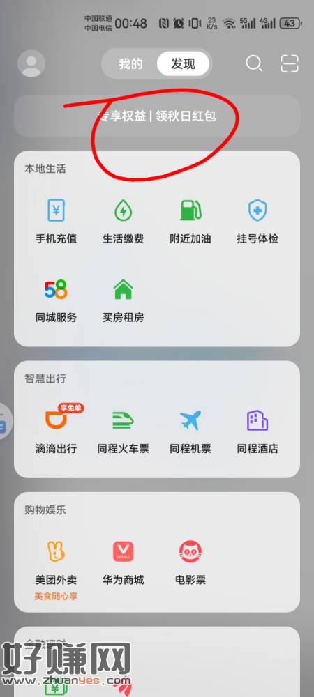华为负一屏,30-5电费,30-5话费只能领一个。然后图2周