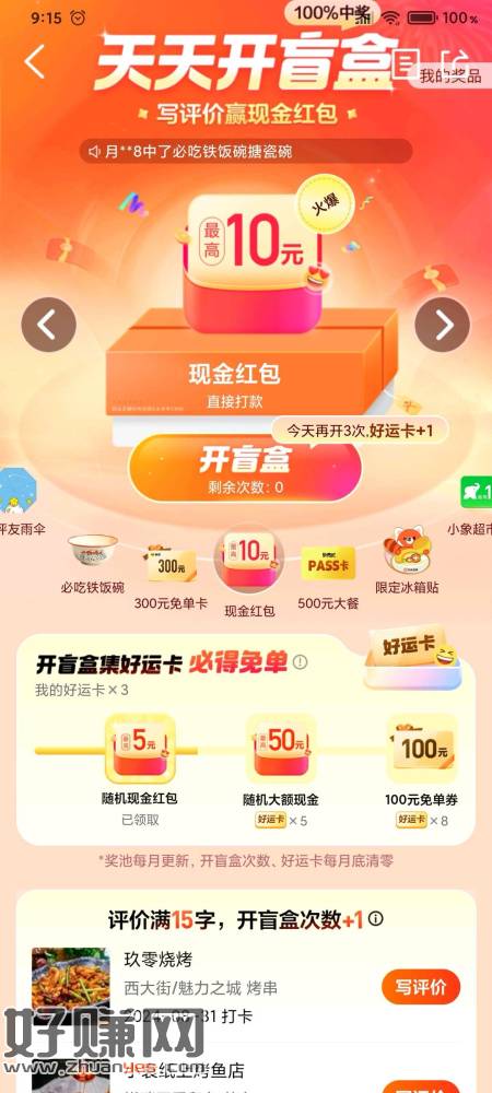 大众点评搜天天开盲盒,评论一个店铺即可参与,每个月都可以参与一次,必中,参与过可能就没有