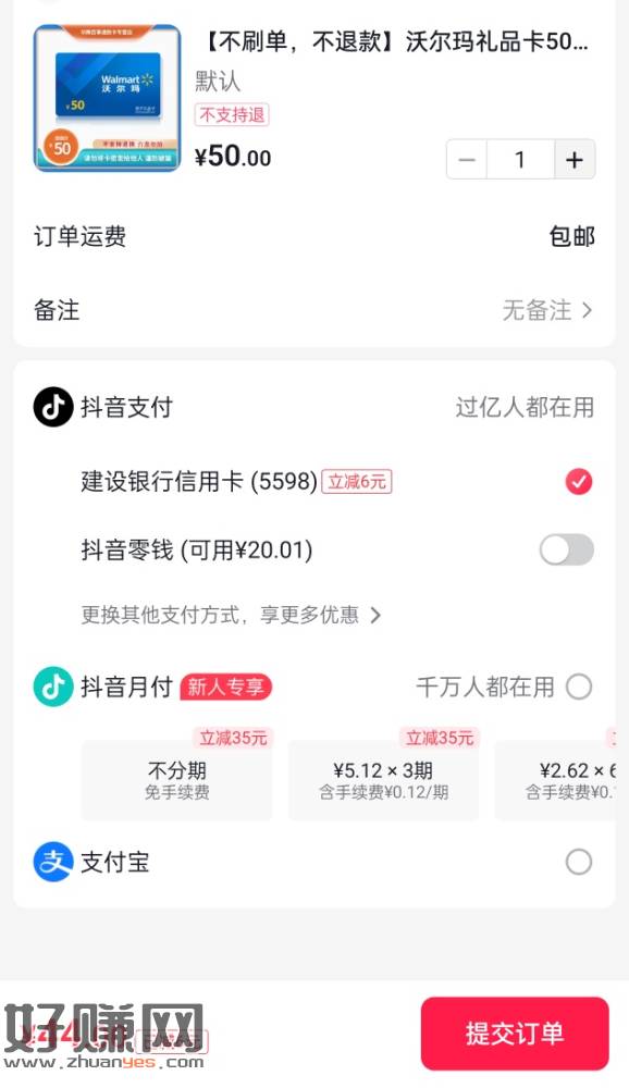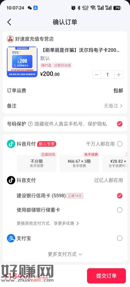 还有名额 每月一次 抖音建行信用卡200-16 和50-6 买沃尔玛即可
