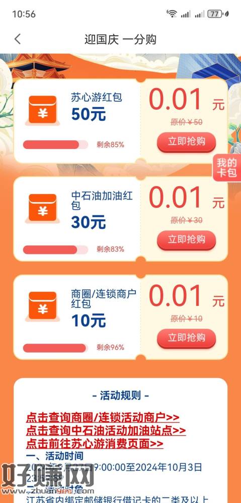 邮政app,活动专区,下拉迎国庆一分购中石油加油红包领了在数字人民币邮储钱包里能看到