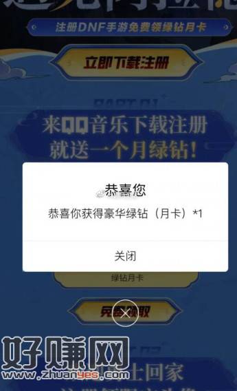 【地下城与勇士手游领绿钻月卡】注册过的换区即可!跳转到QQ音乐APP->下载注册游戏->跳过新手并设置昵称->返回页面领绿钻月卡