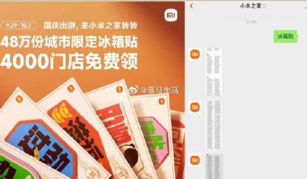 【小米之家到店免费领取冰箱贴】微信#公众号:小米之家 回复“冰箱贴”查看附近门店,9月29日~10月7日期间到店可直接领冰箱贴