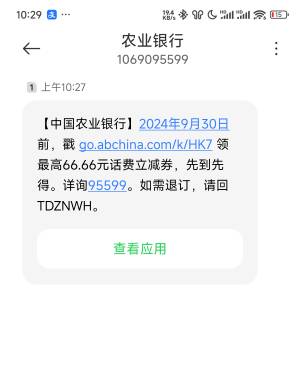 山东的去【中国农业银行】2024年9月30日前,戳 go.abchina.com/k/HK7 领最高66.66元话费立减券,先到先得。详询95599。如需退订,请回TDZNWH。