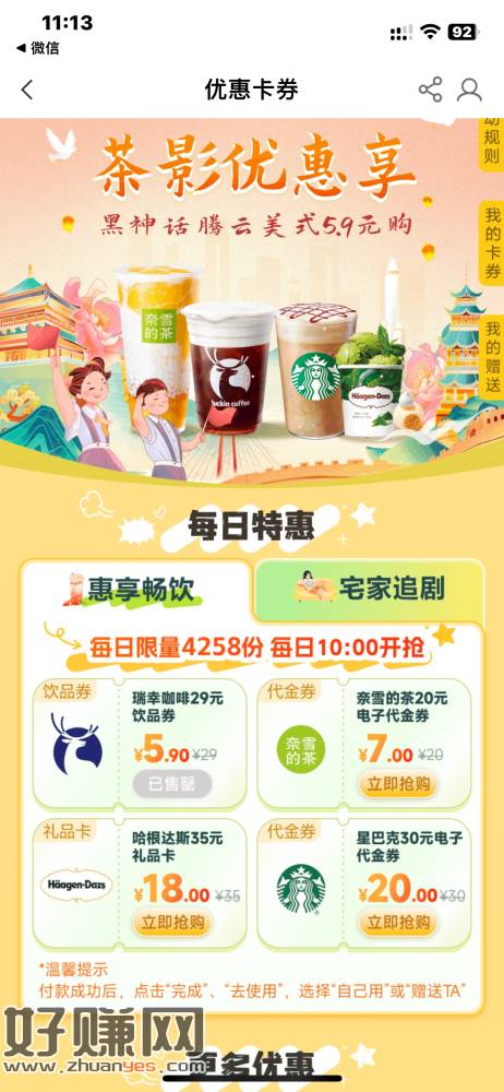 农行-热门活动-优惠卡券 20买30元星巴克代金券,润6左右