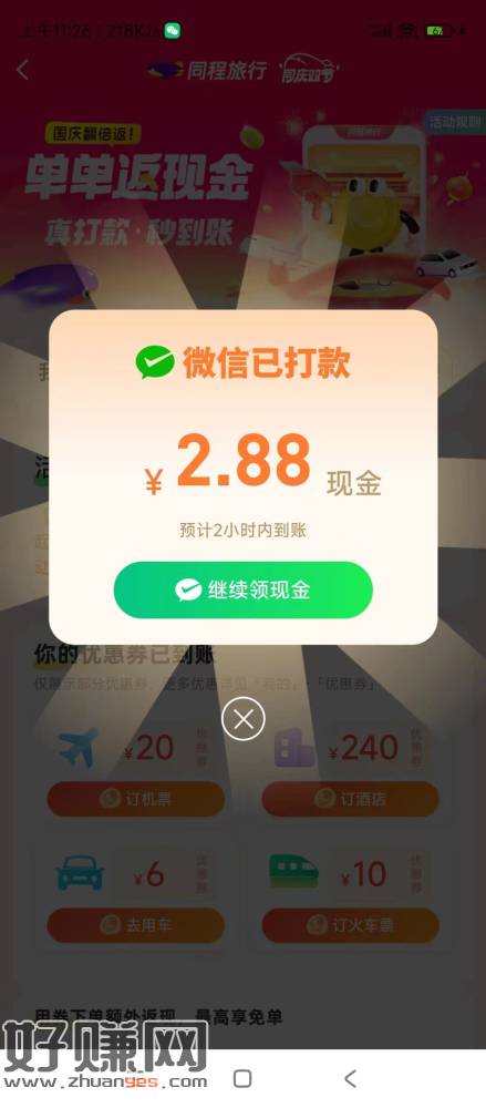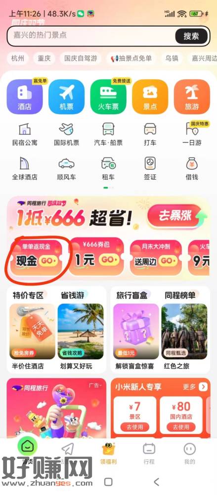 秒到2.88元打开同程旅游app,首页搜索领现进