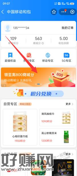 支付宝APP搜“中国移动和包”,如图滚动横幅 最高800 我的300