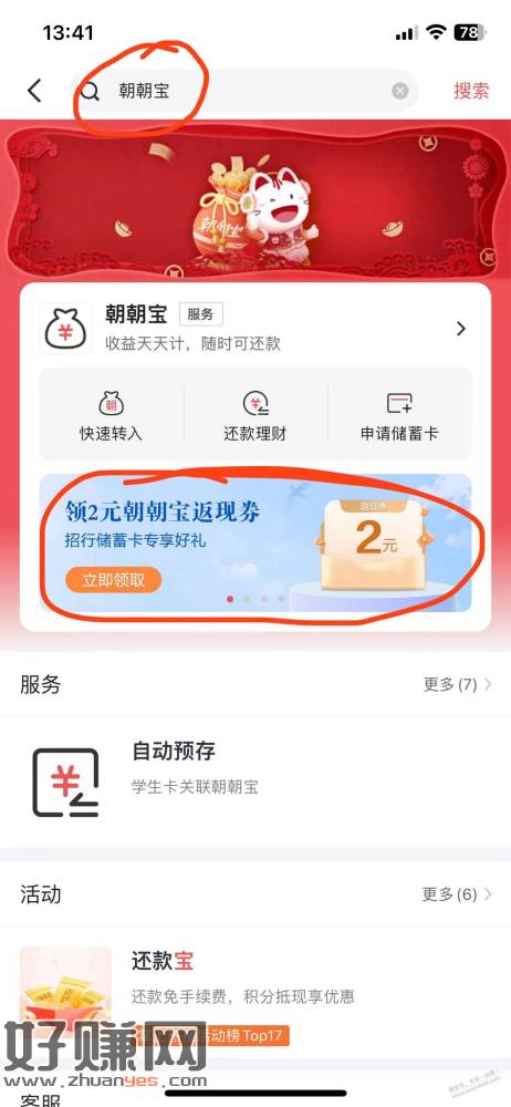 搜索“朝朝宝”,点击图片,转入5元,返现2元
