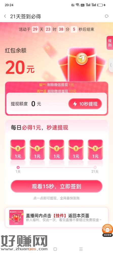 斗鱼 随便点个直播间右下角有个观看+1 应该是每天1毛可以签到21天 我是老号 不知道新号有没有。提现秒到v