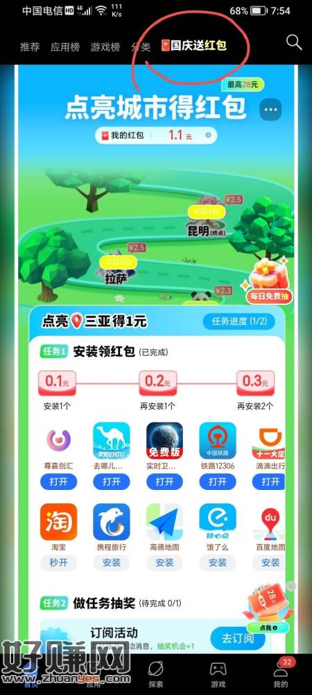 荣耀应用商店首页这个惊喜红包做任务到10.6,最低20