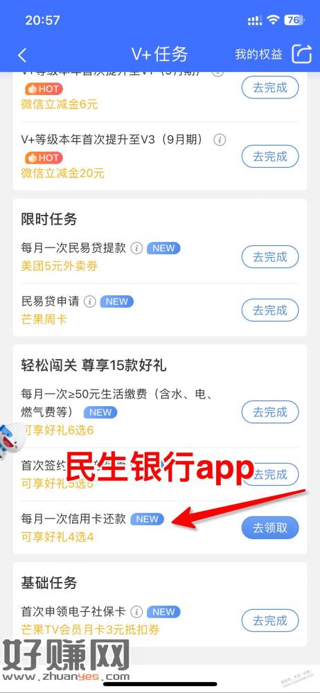 民生银行app-首页--v+任务,进去,还他行xing/用卡即可完成,得的是储蓄卡立减金