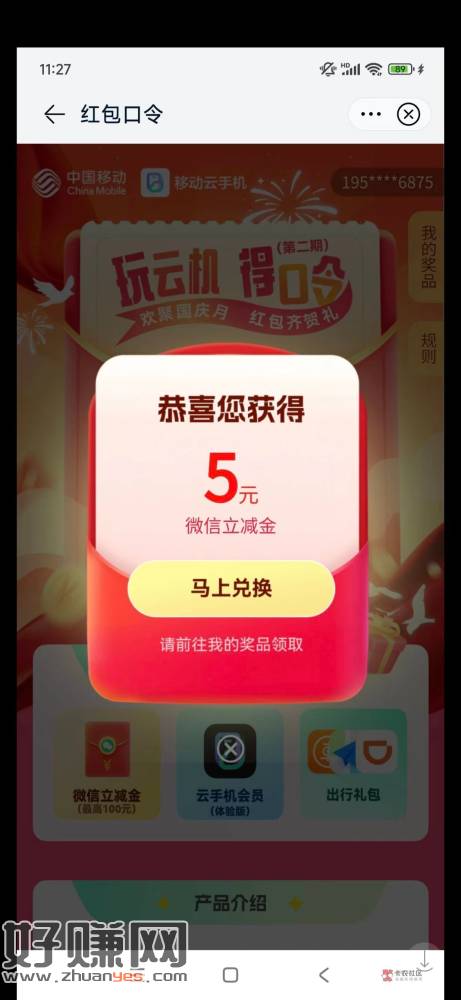 移动云手机,首页横幅国庆抽奖,新号码应该大概率立减金吧,我电信号码还中了2。