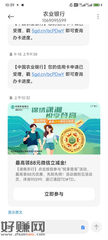 【湖南农行】戳go.abchina.com/k/Vn7 参与“悦享登高”活动,最高享88元优惠,先到先得!活动细则见活动页谨慎受骗,详询95599。退订请回TD#TD