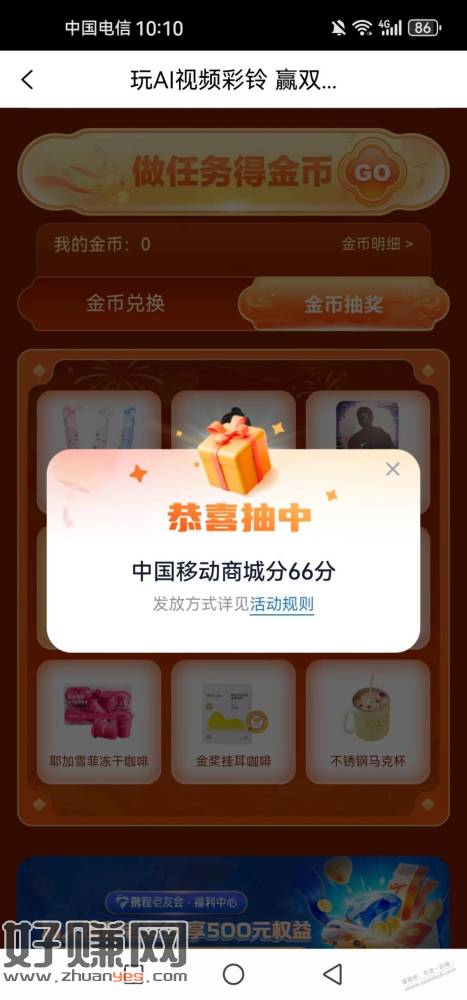 和包首页顶部那个国庆活动下面,有个轮播图,点击AI视频彩铃那个,再下拉到做任务领金币任务,点击登陆,再点击金币抽奖,1金币抽,好像登陆就有1金币,基本上都中66积分。