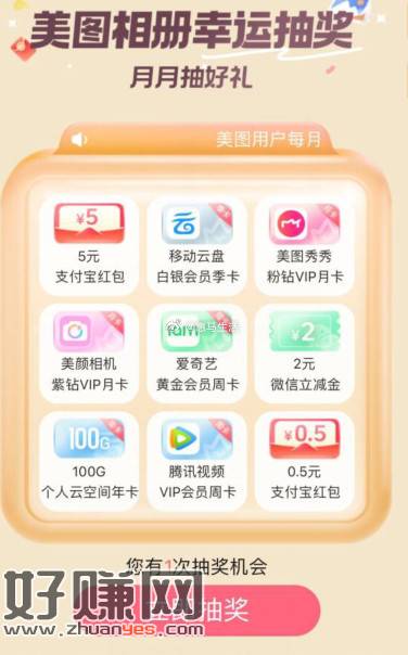 大全4活动8,每个月有1次机会,直接抽0.3~5亓立减金或红包、优酷/爱奇艺/腾讯视频会员周卡等奖