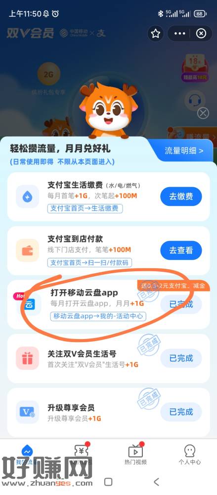 支付宝双v会员的去,支付宝搜索双v会员,点赚流量,打开移动云