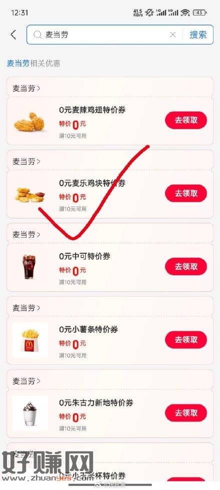 支付宝搜消费券,再搜麦当劳,有0元麦乐鸡,需要满10元,可以搭配1+1使用,页面其他按需,只能带一个