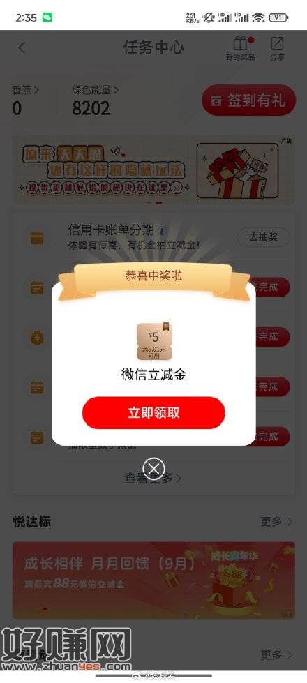 工行,任务中心,信用卡账单分期试试,刚中5元,可以
