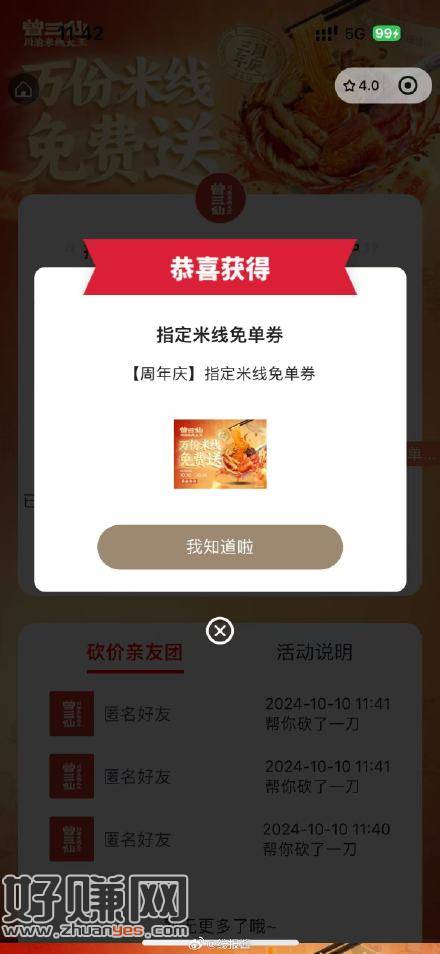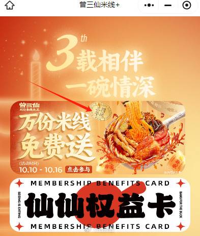曾三仙米线,会员中心,邀请三人助力得免费券