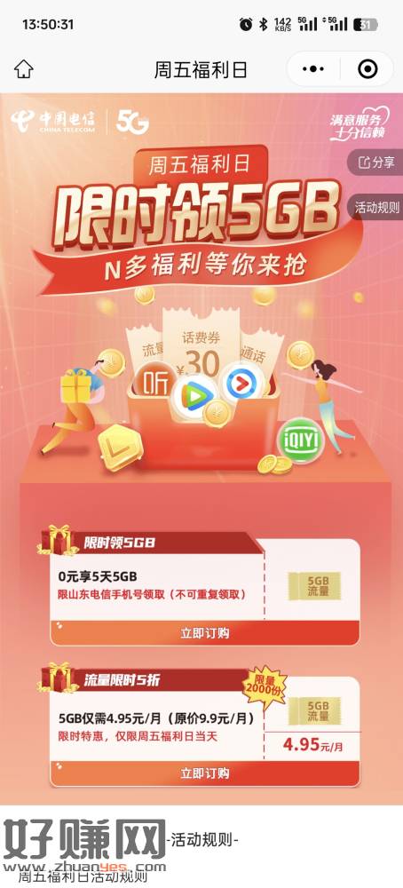 山东电信0元5g流量 有效期5天 用流量进 不要用wifi