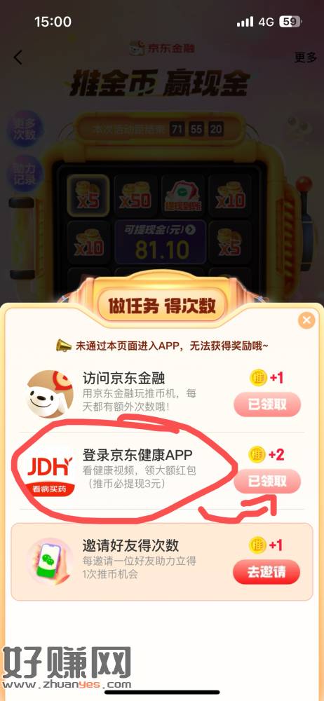 下载京东金融 搜推币 进去更多任务 京东健康做了必提3+ 秒