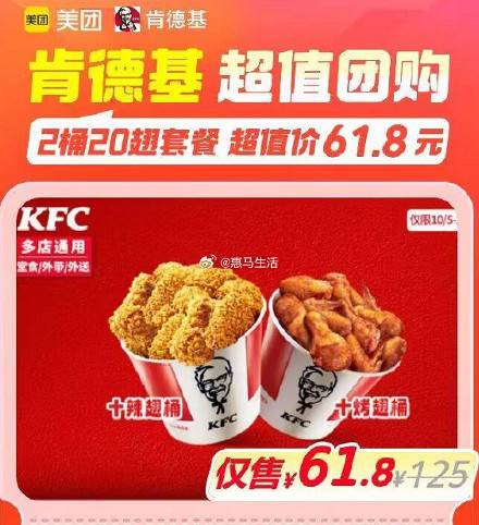 肯德基2桶20翅,到手仅61.8元!