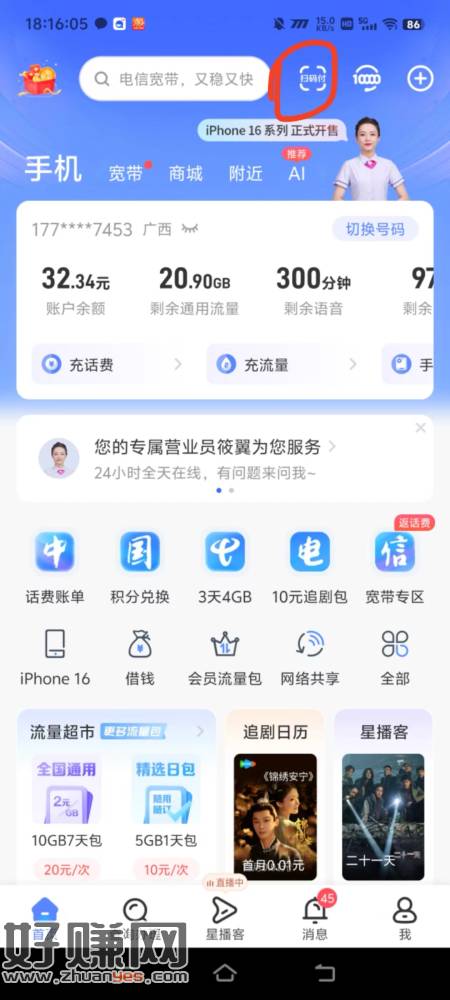 电信app我的钱包右下惊喜红包领权益金,多号,基本1左右,两倍扫微信码套